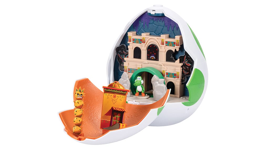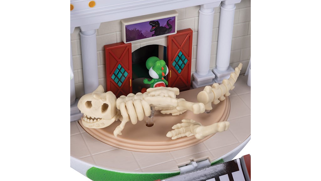 Rozbij to zielone Yoshi jajo i odkryj w środku fascynujący, dwustronny zestaw do zabawy! Po stronie Nowego Jorku ożywa historyczne muzeum z kompletnym, rozpadającym się szkieletem dinozaura, natomiast po stronie Dry Outpost znajdziesz magiczną rurę, poruszające się po naciśnięciu przycisku nietoperze oraz wyskakującego Pokey. W zestawie znajduje się również 3,8-centymetrowa figurka Yoshi oraz Fire Mario, dzięki czemu dzieci mogą od razu rzucić się w wir przygód. Ten zestaw do zabawy to doskonały wybór dla każdego fana Super Mario, ponieważ zapewnia ekscytującą, interaktywną zabawę, a dzięki szczegółowemu wykonaniu świetnie prezentuje się także na półce kolekcjonera.
