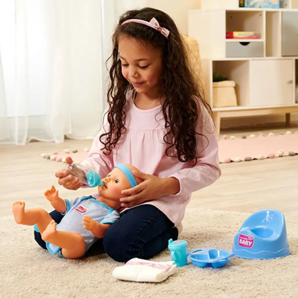 Dziewczynki w końcu mogą spróbować swoich sił w roli troskliwej mamy dzięki tej uroczej lalce New Baby Born. Lalka ma ponad czterdzieści centymetrów i jest niezwykle realistycznie wykonana, wygląda jak prawdziwe niemowlę. Małe mamusie będą mogły zadbać o swoją lalkę, karmiąc ją, tak jak prawdziwego noworodka, następnie posadzić ją na nocniczku, jeśli będzie musiała zrobić siusiu, lub zmienić pieluszkę, jeśli się zmoczy. Butelkę można napełnić wodą i podać lalce do ust, dzięki czemu zacznie pić. Lalki, które można karmić i które robią siusiu, nie tylko dostarczają wspaniałej zabawy, ale także uczą dzieci troskliwości!