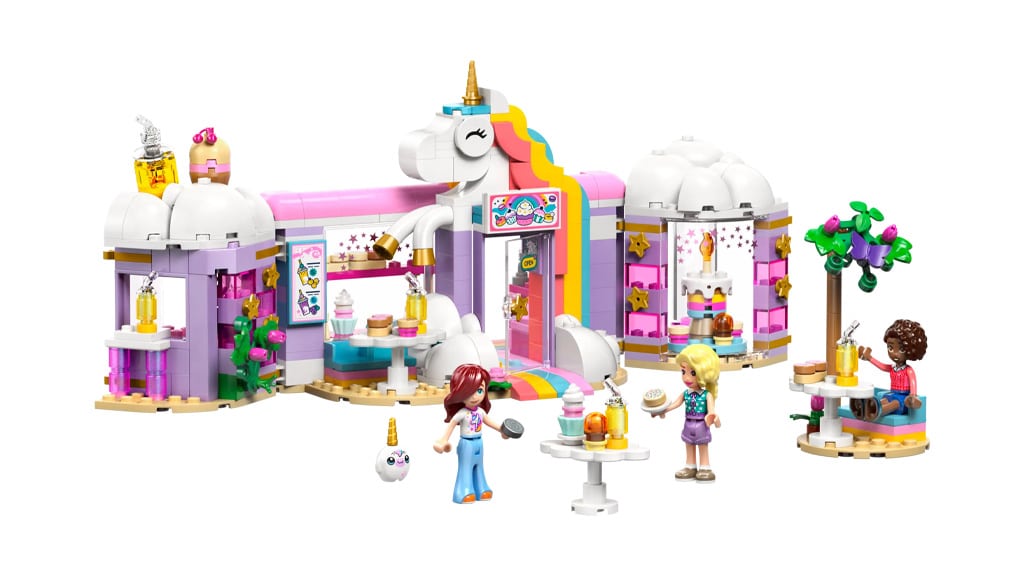 Nawet najmłodsi mogą zbudować LEGO Friends Jednorożcową Kawiarnię Marzeń. Ten zestaw konstrukcyjny składający się z 475 elementów zawiera trzy minifigurki, bar z sokami i koktajlami, akcesoria o tematyce jednorożca, obrotowy stojak na babeczki oraz wiele innych ekscytujących elementów. Kolorowe i kreatywne części zestawu pomagają rozwijać wyobraźnię i zręczność dzieci, zapewniając jednocześnie godziny świetnej zabawy. Motywy jednorożca oraz bogato zdobione akcesoria sprawiają, że ten zestaw jest szczególnie atrakcyjny dla każdego małego budowniczego.