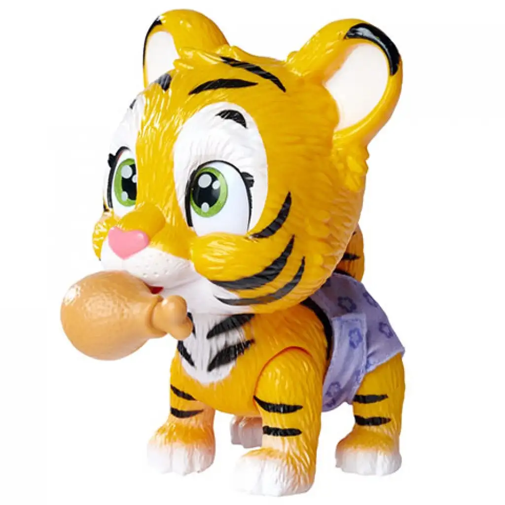 Adoptowanie tygrysa nie jest zbyt łatwe, ponieważ jego właściwe wychowanie stanowi duże wyzwanie, ale dzieci z pewnością poradzą sobie z tym zadaniem. Zanim nazwiesz swojego pupila, musisz ustalić, czy to dziewczynka, czy chłopiec. W tym celu zwilż jego łapkę i od razu zobaczysz, czy zmieniła się na różowy czy niebieski kolor. Mały tygrysek o błyszczących oczach jest jeszcze bardzo malutki i nosi pieluszkę, do której oczywiście często siusia. Napój i nakarm go pyszną kurzą pałką, a potem zmień mu pieluszkę – jej wnętrze żółknie, gdy jest pełna. Zestaw zabawkowy oprócz tygrysa zawiera także trzy niespodzianki, które mogą się przydać do opieki i karmienia, a także znajduje się w nim akt adopcyjny.