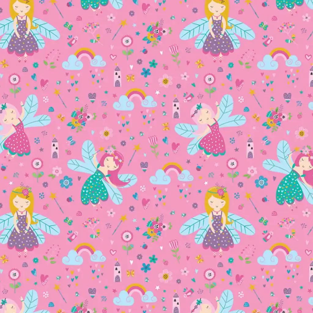 Jeśli chcesz naprawdę uczynić obdarowywanie magicznym przeżyciem, ten papier do pakowania z motywem wróżek i tęczy będzie doskonałym wyborem! Na pięknym, różowym tle arkusza o wymiarach 100x70 cm zobaczysz urocze wróżki, błyszczące czarodziejskie różdżki, kolorowe tęcze i bajkowe zamki, które przywołują atmosferę baśniowego świata.