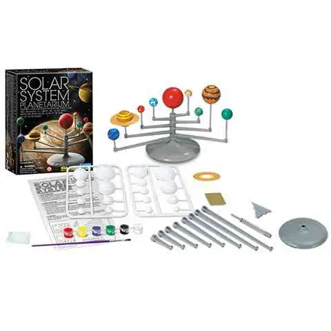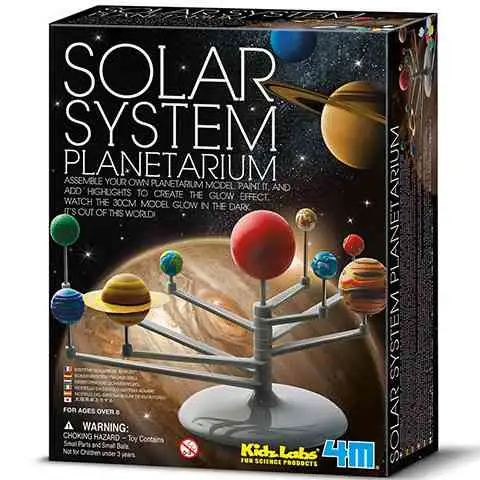 Spośród niezliczonych naukowych zabawek firmy 4M, planetarium Układu Słonecznego jest chyba najbardziej efektowne, ponieważ zawiera model Układu Słonecznego o średnicy 30 cm, który możesz samodzielnie złożyć, a nawet świeci w ciemności. Najpierw musisz zmontować obrotową podstawkę, potem białe elementy planet, nie zapomnij również założyć pierścieni Saturna. Następnie wystarczy, że pomalujesz planety i umieścisz je na ich miejscach. W zestawie znajdziesz też farbę fluorescencyjną, którą możesz pomalować swoją ulubioną planetę, aby świeciła w ciemności.