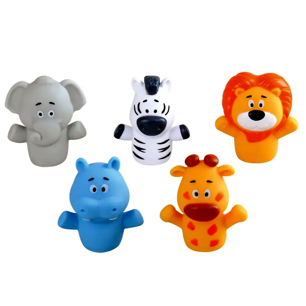- zestaw pięciu pacynek na palce ze zwierzętami safari (słoń, lew, żyrafa, hipopotam, zebra)