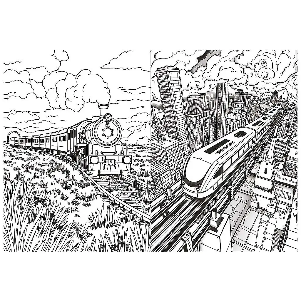 Różnorodne ilustracje parowozów, superszybkich pociągów i miejskich składów