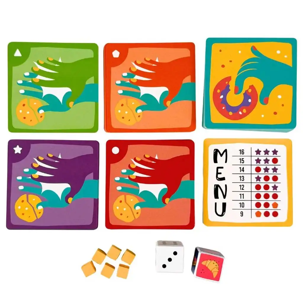 El a kekszekkel! to naprawdę dynamiczna i wesoła gra planszowa na refleks, która gwarantuje ożywienie rodzinnych lub przyjacielskich wieczorów z grami. Zgodnie z fabułą, nieodparty zapach świeżo upieczonych ciasteczek przyciąga wszystkich do piekarni, ale zwycięzcą może zostać tylko ten, kto jest najszybszy i najbardziej spostrzegawczy. W trakcie gry dwie kostki decydują, na którą kartę należy zareagować, jednak zadanie wcale nie jest takie proste. Jak gra postępuje, pojawia się coraz więcej zasad i ograniczeń, które wymagają ciągłej uwagi i szybkiego podejmowania decyzji. Czasem liczy się kolor ciastka, innym razem jego kształt lub to, do których kart nie wolno sięgać. Dzięki możliwości dostosowania poziomu trudności, zarówno młodsi, jak i starsi mogą cieszyć się rozgrywką, co sprawia, że gra stanowi ekscytujące wyzwanie dla każdego wieku. Jeśli chcesz, by Twoje dziecko podczas zabawy rozwijało czas reakcji i koncentrację, ta gra jest strzałem w dziesiątkę.