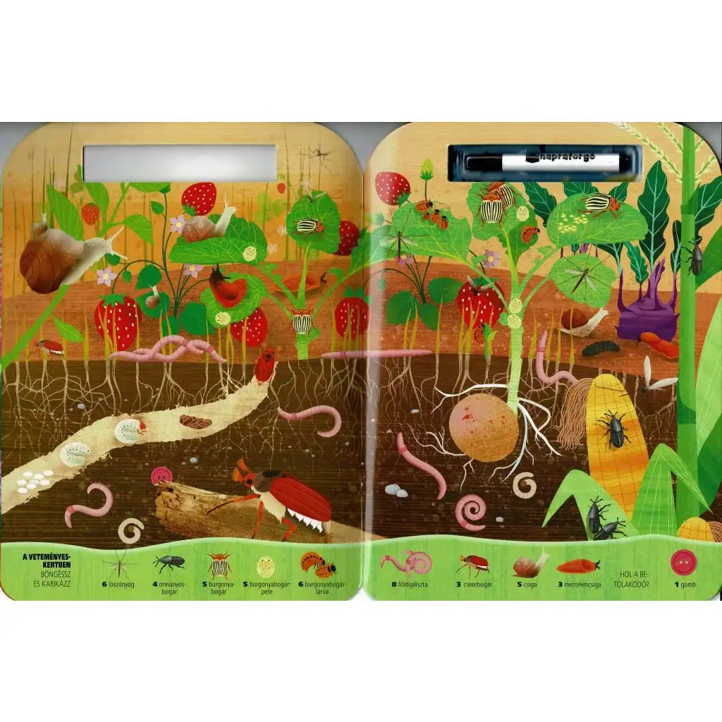Böngéssz i zakreśl! – Książka o robakach zaprasza dzieci w ekscytującą podróż odkrywczą do świata owadów. Zasada książki jest prosta, a jednocześnie niezwykle motywująca: znajdź małe robaczki i inne owady na kolorowych, szczegółowych ilustracjach, a następnie zakreśl je dołączonym zmywalnym flamastrem! Jeśli chcesz, jednym ruchem możesz usunąć oznaczenia, dzięki czemu możesz zaczynać przygodę od nowa, raz po raz.