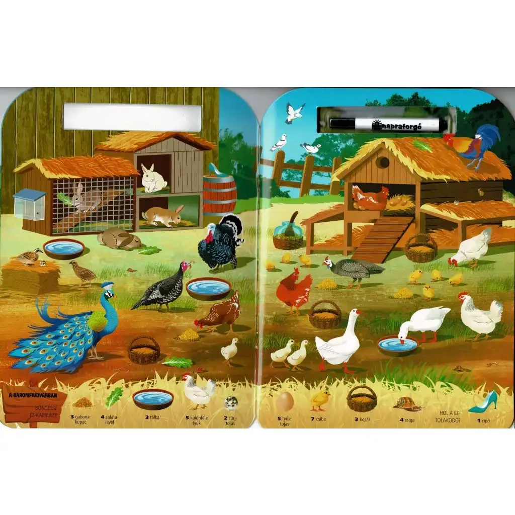 Na ilustracjach w książce ożywają zwierzęta, przedmioty i codzienne życie na wsi. Zadaniem dzieci jest odnalezienie i zakreślenie załączonym flamastrem wskazanych elementów. Zabawa jest nie tylko wciągająca, ale także rozwija spostrzegawczość, koncentrację oraz percepcję wzrokową.
