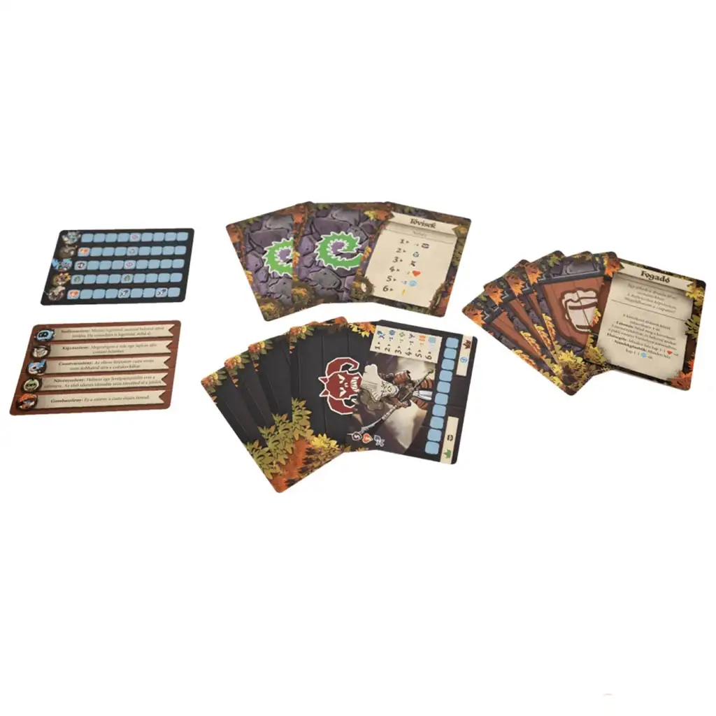 Tę ostatnią umieśćcie po jednej stronie planszy i na niej połóżcie przetasowane pozostałe karty lasu. Następnie odwróćcie znaczniki potworów, przetasujcie je i umieśćcie obok planszy. Osobno żonglujcie kartami i utwórzcie trzy odwrócone stosy. Środek wypełnijcie znacznikami, aby każdy miał do nich łatwy dostęp.