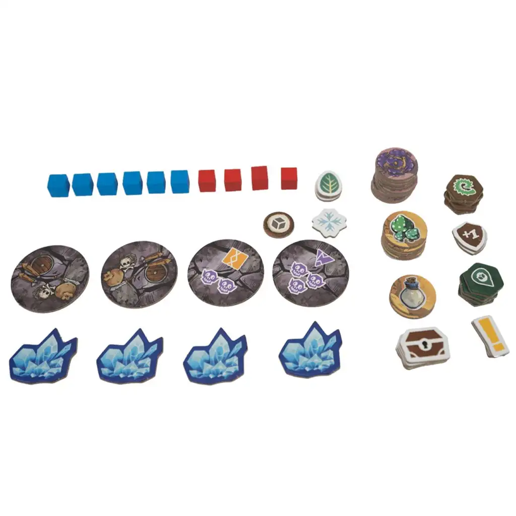 - 1 książka zasad, 4 tablice bohaterów, 4 figury bohaterów, 4 kości bohaterów (czerwone), 4 kości bitewne (czarne), 4 kości mocy (fioletowe, zielone, niebieskie, pomarańczowe), 4 czerwone znaczniki, 6 niebieskich znaczników, 24 płytki lasu, 25 kart łupów, 12 kart wydarzeń, 4 karty mocy bohaterów i inne dodatki