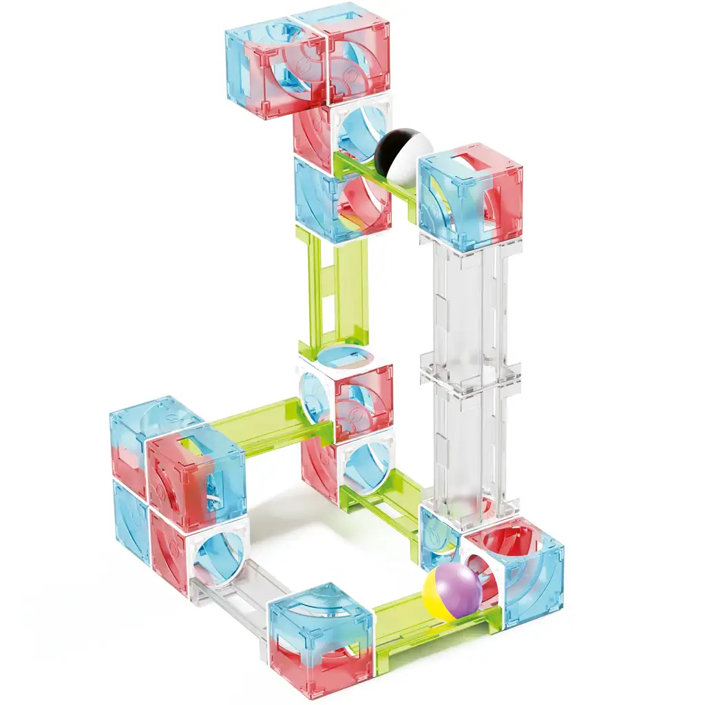 Wyjątkowość systemu Cuboga polega na tym, że kulki nie tylko toczą się w dół, ale dzięki specjalnej konstrukcji toru potrafią poruszać się również poziomo – co zapewnia całkowicie nową jakość zabawy w porównaniu z tradycyjnymi torami kulkowymi. Dzięki temu dzieci naprawdę mogą poczuć się jak inżynierowie: zaprojektować własny system torów, łączyć klocki, tunele, zjazdy i proste odcinki, obserwując, jak kolorowe kulki przemierzają zbudowaną trasę.