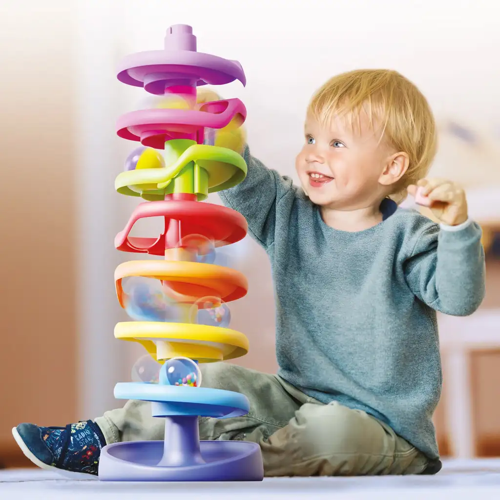 Zestaw zawiera 7 spiralnych torów, stabilną podstawę i 2 kulki – jedna z nich to kolorowa grzechotka, która wydaje dźwięki podczas ruchu, potęgując wrażenia podczas zabawy. Druga kulka, dzięki swoim wyrazistym, kontrastowym wzorom, przyciąga uwagę dziecka i rozwija umiejętność obserwacji. Wieża jest łatwa w montażu, elementy stabilnie do siebie pasują, a podczas zabawy nie tylko rozwijają się ruchy rąk, ale także zaczynają się kształtować pojęcia przyczynowo-skutkowe.