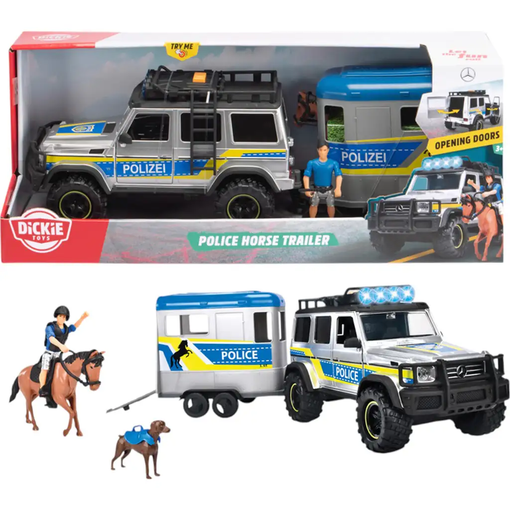 Przygotuj się na wyjątkową policyjną akcję, w której oprócz samochodów ważną rolę odegrają także konie! Zestaw Dickie Toys – policyjny samochód z efektami świetlnymi i zestawem do przewozu koni to idealny wybór dla małych policjantów, którzy uwielbiają ekscytujące historie i różnorodne możliwości zabawy. Ten szczegółowo wykonany zestaw pojazdów składa się z terenowego Mercedesa-Benz klasy G, przyczepy do przewozu koni oraz kilku dodatkowych figurek – wśród nich policjant na koniu, koń, pies policyjny oraz policjant.