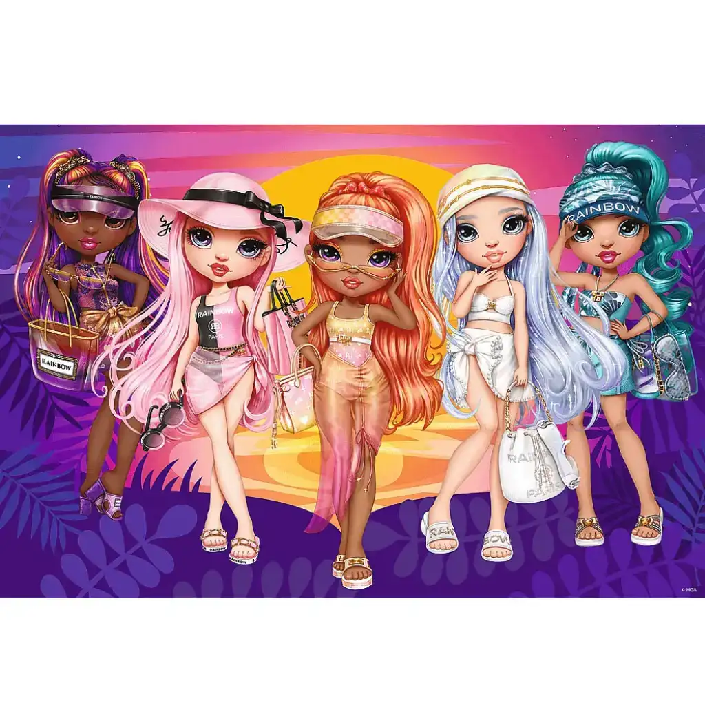 Obrazek można łatwo ułożyć dzięki wysokiej jakości i precyzyjnemu wycięciu, dzięki czemu elementy idealnie do siebie pasują. Rozmiar ułożonego obrazka to 41x27,5 cm, na którym widać lalki Rainbow High w modnych i błyszczących strojach, tworząc żywy i kolorowy obraz. Układanie puzzli to nie tylko świetna zabawa, ale także rozwija logiczne myślenie, sprawność manualną i cierpliwość dziecka.