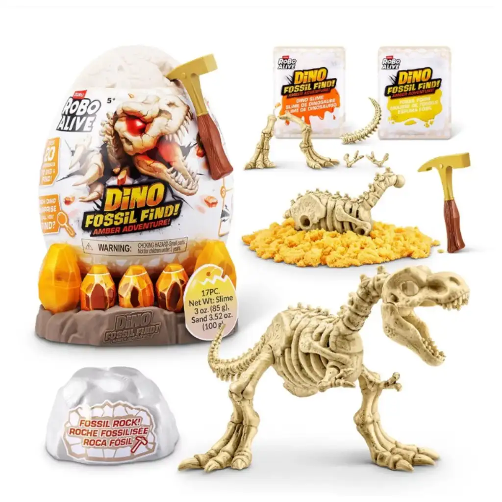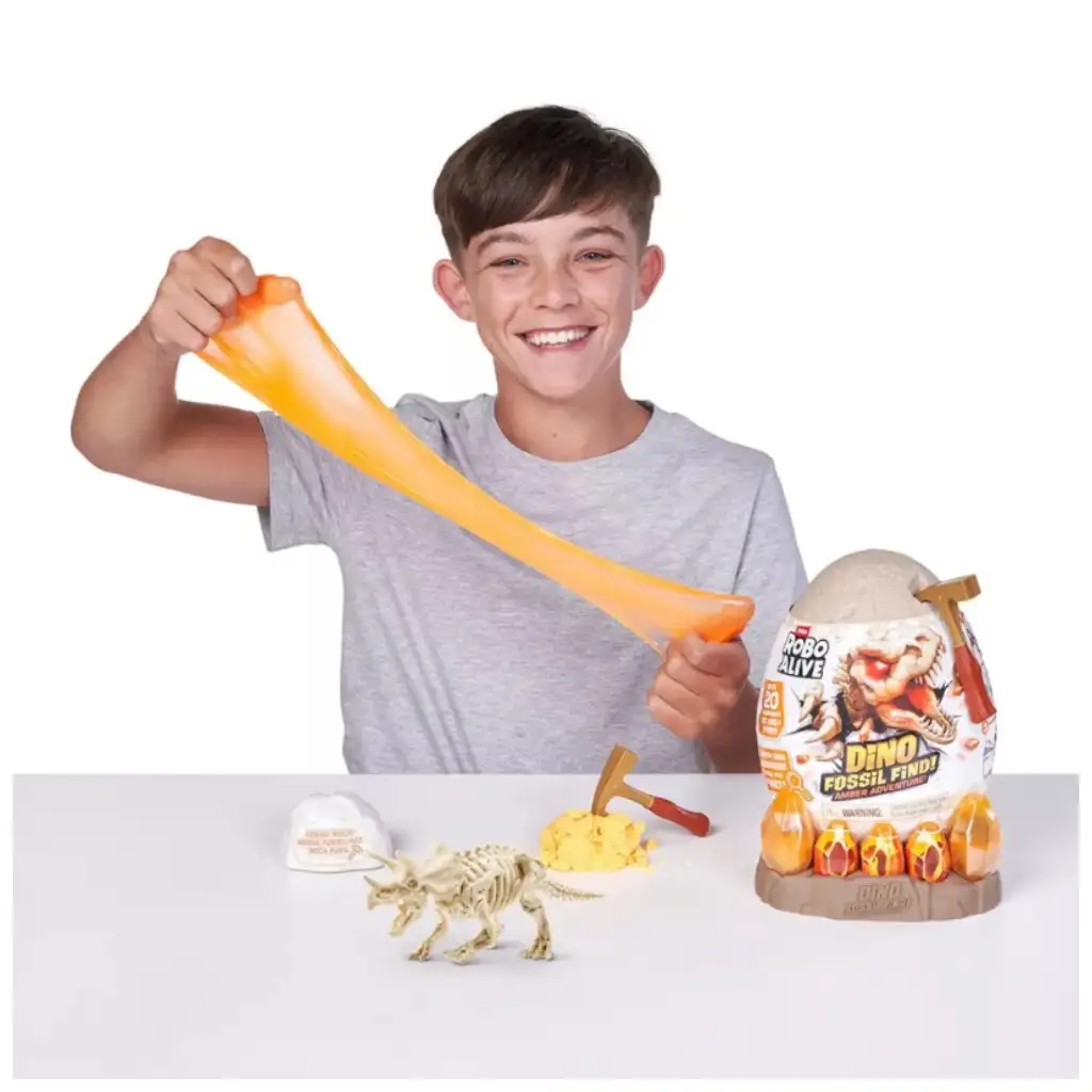 Odkryj tajemnice przeszłości z zestawem Robo Alive Dinozaurza Skamieniałość – Bursztynowa Przygoda! Przygotuj się na ekscytujące wykopaliska, podczas których musisz przebić się przez warstwy skał i piasku, aby odkryć starożytne szczątki dinozaura. Specjalny slime-lawa urozmaica przygodę: świeci, rozciąga się i sprawia, że eksploracja jest jeszcze bardziej emocjonująca.