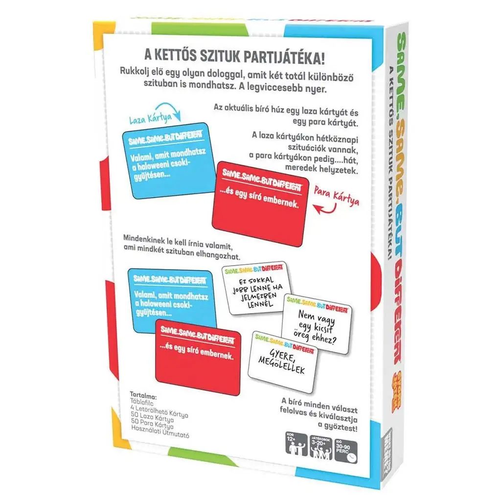 Ta gra to prawdziwy strzał w dziesiątkę na każdą imprezę lub spotkanie towarzyskie, gdzie liczy się śmiech i kreatywność. Znasz tę sytuację, gdy wypowiadasz zdanie i uświadamiasz sobie, że w zupełnie innej sytuacji miałoby ono całkiem inne znaczenie? No właśnie to zabawne odkrycie przynosi wam gra planszowa Same Same but Different! Chodzi o to, aby wymyślić zdanie, które pasuje do dwóch zupełnie różnych sytuacji – i oczywiście, żeby było jak najzabawniejsze!