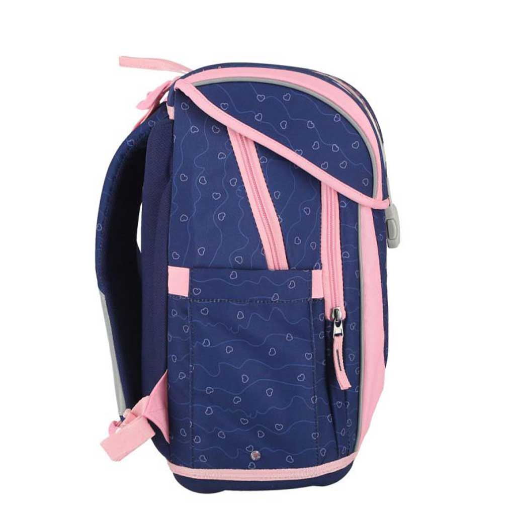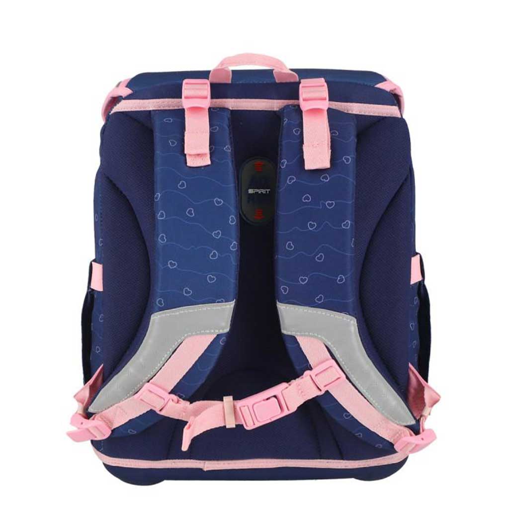 Wnętrze torby jest przemyślane: w dużej komorze wygodnie mieszczą się książki, zeszyty lub nawet śniadaniówka, natomiast wewnętrzna kieszeń z siatkową przegrodą pomaga w organizacji. Dwie duże, rozszerzalne kieszenie boczne są idealne na bidon lub mniejsze akcesoria. Ergonomicznie wyściełane i regulowane paski na ramiona oraz regulowana wysokość zapewniają, że torba wygodnie dopasowuje się do pleców dziecka. Solidna dolna część z odlewanych nóżek daje dodatkową stabilność, a samoregulujące przednie zamknięcie z elementami odblaskowymi zwiększa bezpieczeństwo na co dzień.