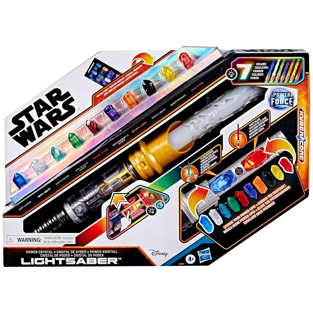 Dzieci mogą umieścić dwa kryształy w rękojeści – jeden odpowiada za kolor ostrza, drugi za kolor rękojeści. Po włożeniu kryształów miecz zaczyna świecić i wydawać dźwięki, co czyni zabawę jeszcze bardziej realistyczną. Zestaw zawiera rozkładane, świecące ostrze, efekt wybuchu mocy, nasadkę, okładzinę rękojeści oraz elektroniczny moduł centralny – z tych elementów dzieci mogą zbudować własny, unikalny miecz świetlny. Wbudowany system przechowywania kryształów zapewnia miejsce na każdy kryształ, a dołączona instrukcja pomoże poznać, jaka moc reprezentuje dany kryształ w galaktyce.