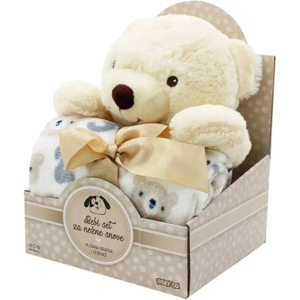 Dwuczęściowy zestaw prezentowy: pluszowy miś i miękki kocyk dziecięcy