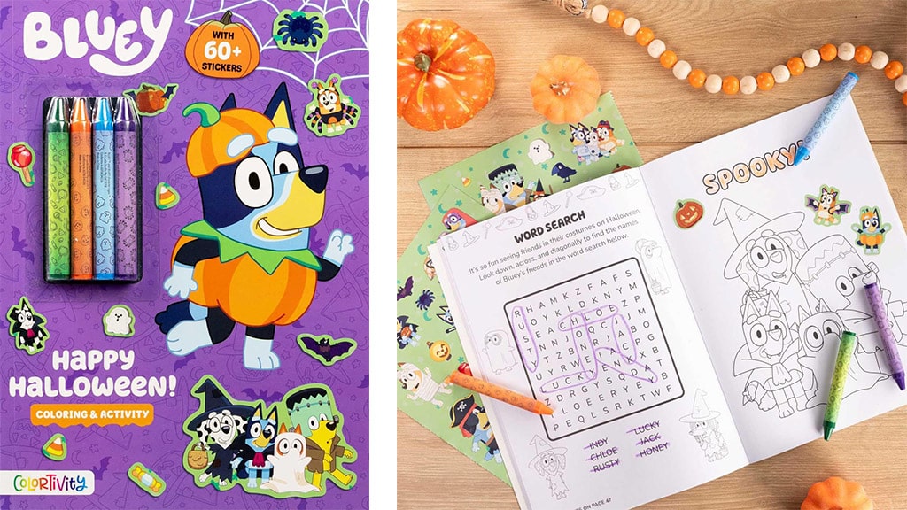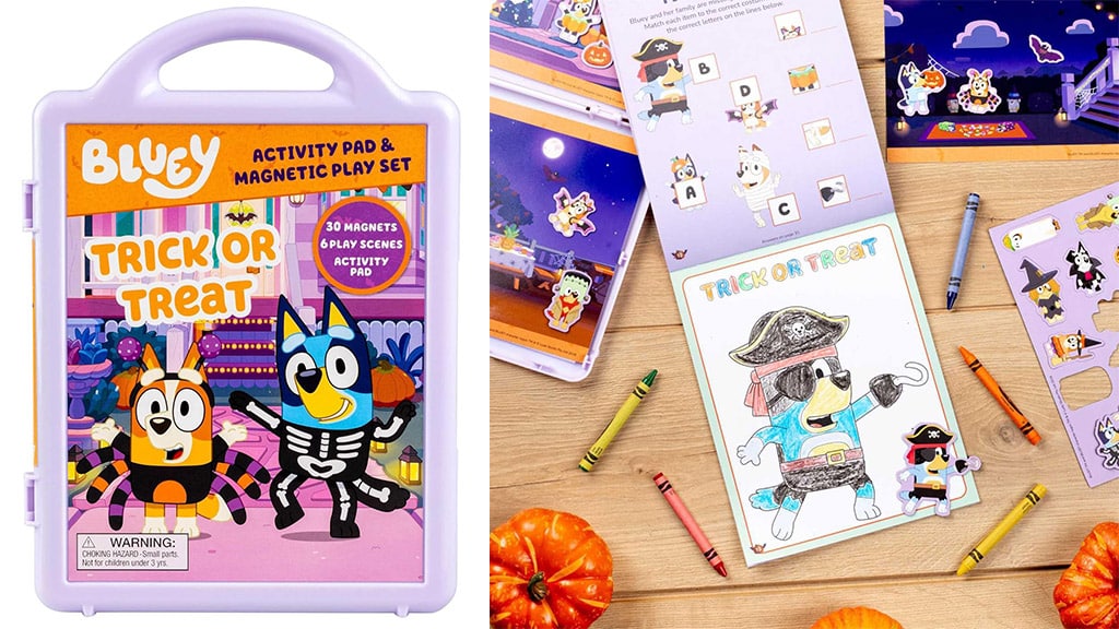 Ten zestaw zawiera 30 magnetycznych elementów, którymi można się bawić. Te elementy mają różne kształty i kolory, dzięki czemu dzieci rozwijają swoją kreatywność oraz zdolności motoryki małej. Magnetyczne elementy łatwo się nakłada i zdejmuje, więc zabawa jest jednocześnie zabawna i pouczająca. To idealny wybór do zabawy w domu lub nawet podczas podróży.Małe dzieci również mogą poczuć atmosferę Halloween dzięki książeczce z okienkami „Bluey i Bingo – Księga strasznych rzeczy”, w której rodzeństwo odkrywa ekscytujące, ale niezbyt przerażające niespodzianki wokół domu – na przykład pełzające robaki w basenie lub tajemnicze tańczące kręgi. Ta książka w zabawny sposób pomaga dzieciom poznać i oswoić swoje lęki, a przy tym wspólnie śmiać się z rodziną. Dla starszych dzieci dostępna jest także kolorowanka i magnetyczny zeszyt z zadaniami, które oferują tuziny interaktywnych zagadek, labiryntów i świątecznych zabaw, dzięki czemu każdy znajdzie dla siebie najbardziej ekscytujące zajęcie w tym pełnym dreszczy sezonie.