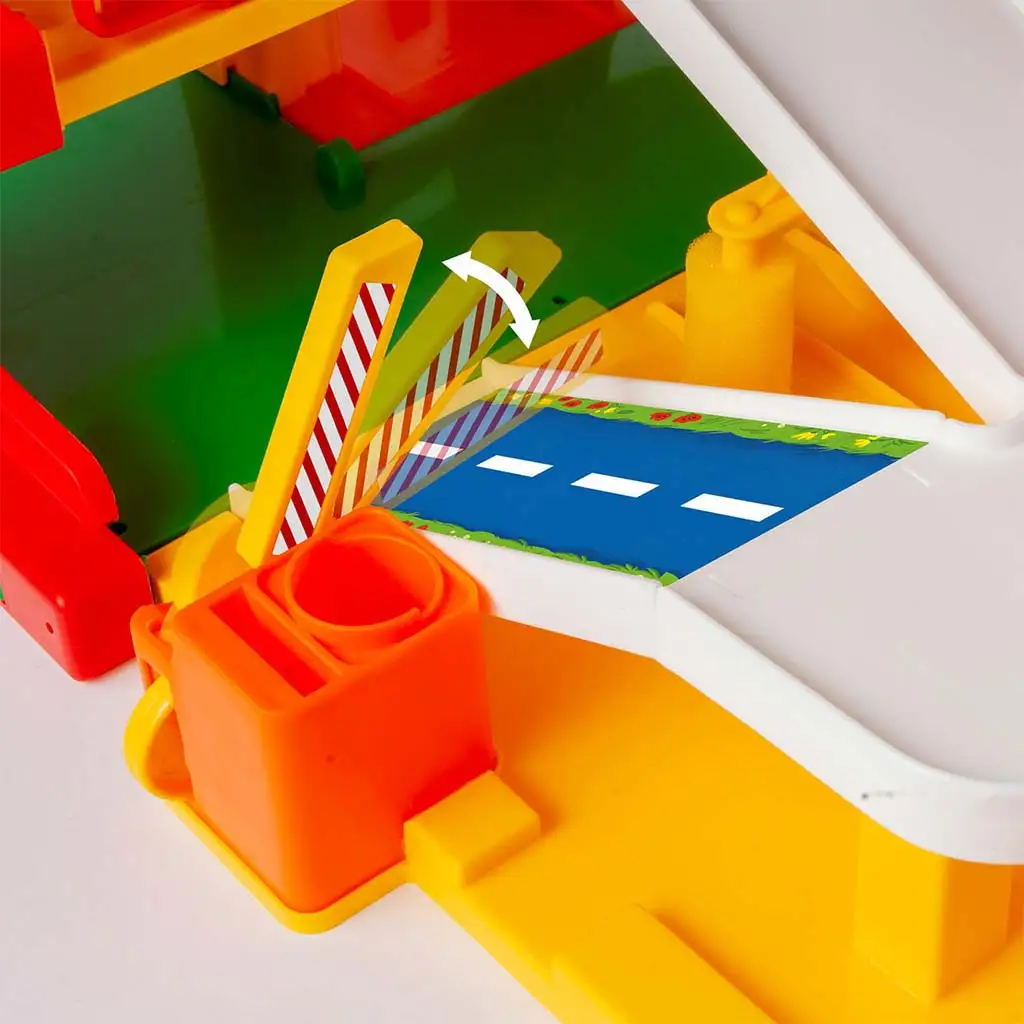 Dzięki ruchomej windzie pojazdy można łatwo podnieść na wyższe poziomy, z których zjadą po rampie. Zestaw zawiera też odcinek drogi o długości ok. 1,5 m, co zapewnia jeszcze bardziej urozmaiconą zabawę i pozwala na stworzenie własnego miejskiego toru. Szlaban, dystrybutor paliwa i inne akcesoria dodatkowo zwiększają realizm, a garaż można spersonalizować dzięki naklejkom.