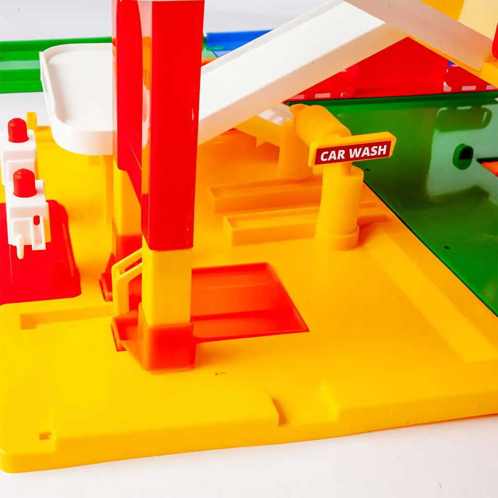 Kolorowy, solidnie wykonany garaż oferuje odkrycia na trzech poziomach: znajdują się w nim miejsca parkingowe, część serwisowa oraz myjnia samochodowa, dzięki czemu małe samochodziki mogą być w pełni „obsłużone”.