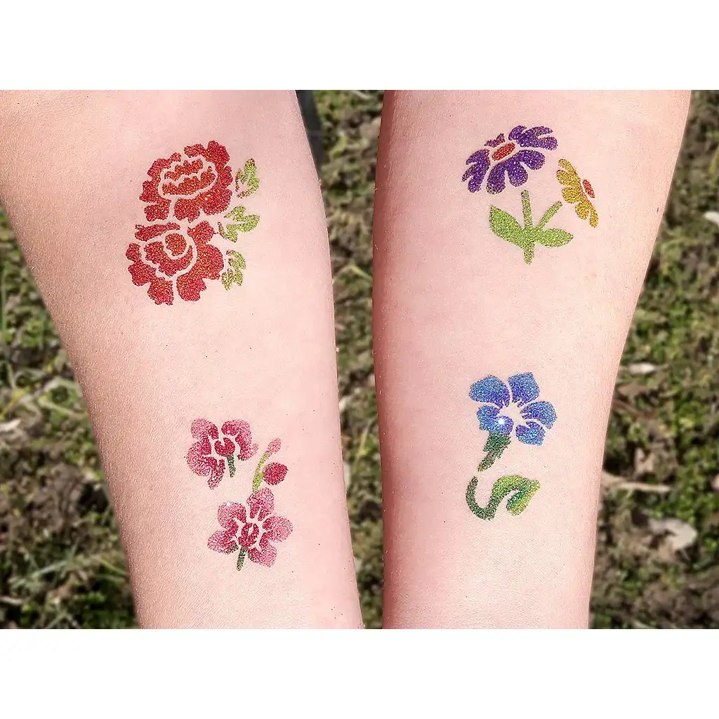 Przyjazne dla skóry, kosmetycznej jakości brokaty świetnie przylegają i przy właściwym użyciu mogą utrzymać się na skórze nawet kilka dni. Czy to motyw kwiatów, motyli, czy superbohaterów – z tym zestawem każdy znajdzie coś dla siebie. Brokaty dobrze kryją, błyszczą się w słońcu i sprawiają, że tatuaże przyciągają uwagę. Ich używanie jest bardzo proste: wystarczy trochę kleju, szablon i można zaczynać zabawę!