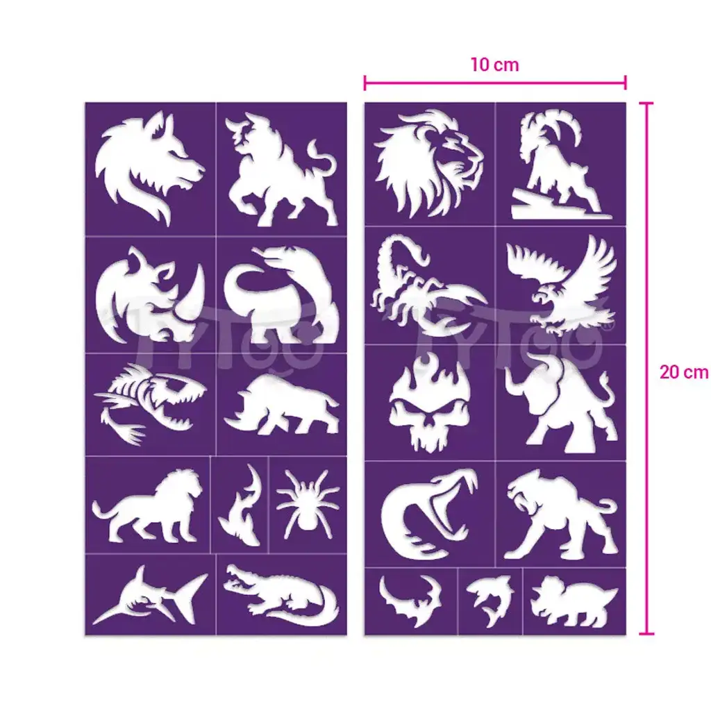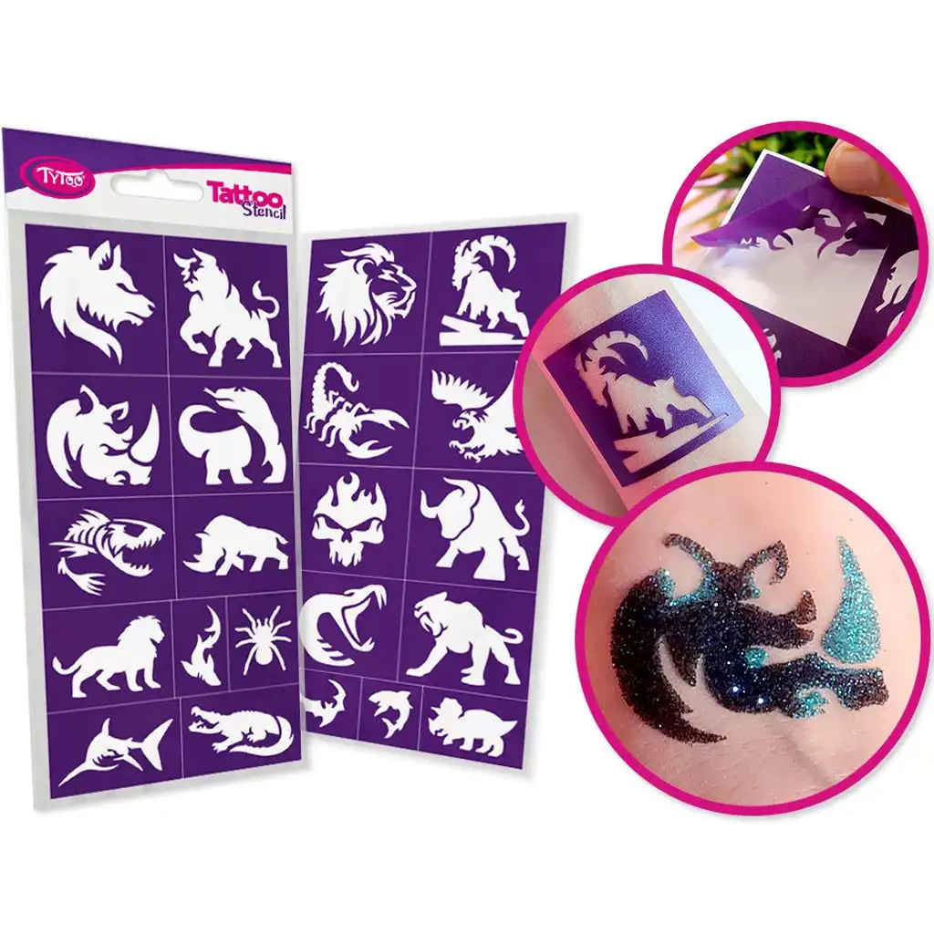 TyToo: Zestaw szablonów do tatuażu brokatowego z dzikimi zwierzętami, 22 szt.