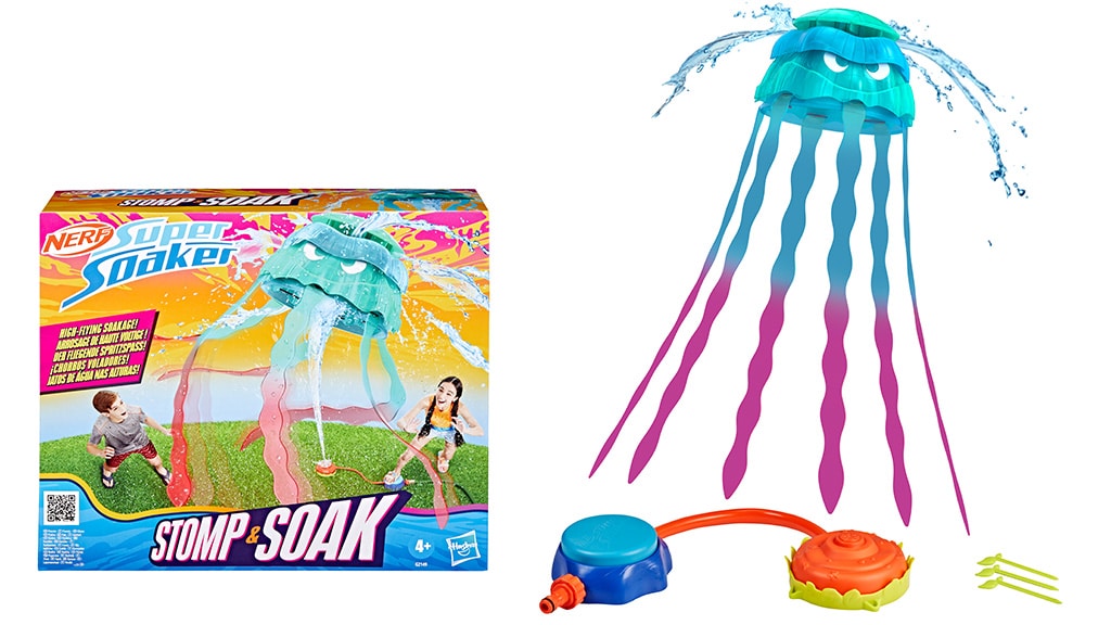Super Soaker Stomp & Soak został zaprojektowany specjalnie dla dzieci od 4 lat. Zabawka zawiera meduzę, którą można wystrzelić w powietrze za pomocą wyrzutni, a z górnej części dzwonu meduzy rozpryskują się strumienie wody. Macki meduzy również rozpryskują wodę we wszystkich kierunkach, co czyni zabawę jeszcze bardziej ekscytującą. Wystarczy podłączyć wyrzutnię do działającego węża ogrodowego, a Super Soaker Stomp & Soak natychmiast zapewni rozrywkę! Ta zabawka to doskonały wybór na letnie wodne bitwy i gwarantuje świetną zabawę podczas imprez w ogrodzie lub rodzinnych spotkań.