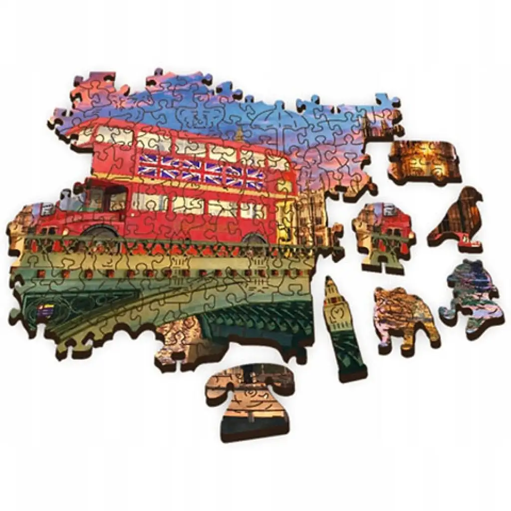 Magiczny obraz Londynu można znaleźć w wielu układankach, jednak ten zestaw z pewnością należy do najoryginalniejszych, ponieważ drewniane elementy puzzli zawierają unikalne kształty, takie jak Big Ben, ikoniczny piętrowy autobus czy sam Sherlock Holmes. Elementy puzzli Trefl Wood Craft idealnie do siebie pasują, a dzięki profesjonalnym, precyzyjnym procesom drukarskim gotowy obraz jest zachwycająco wyraźny i pełen żywych kolorów. Nieregularne kształty oraz tematyczne elementy otwierają całkowicie nowy wymiar w układaniu puzzli. Drewniane elementy puzzli mają dekoracyjny wzór na odwrocie, a cały zestaw zapakowany jest w ekologiczne pudełko wykonane z przetworzonej tektury.