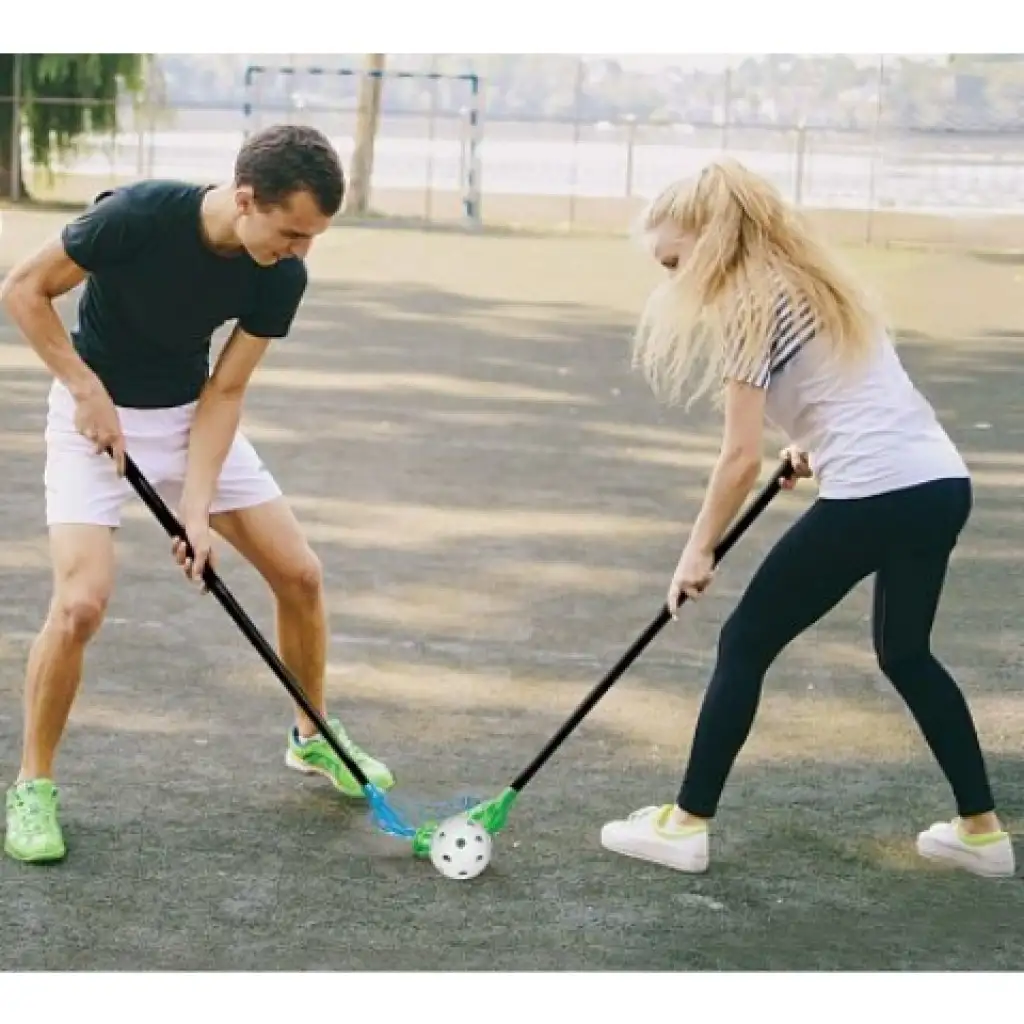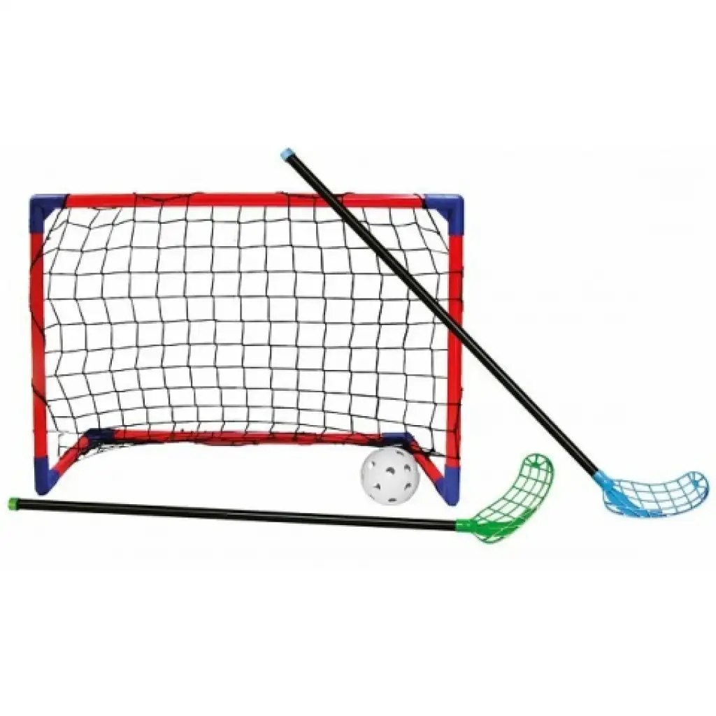 Floorball to dynamiczna, szybka gra z piłką, która posiada zasady podobne do hokeja na lodzie, jednak do gry nie są potrzebne takie same warunki jak w hokeju. Gra może być rozgrywana zarówno na zewnątrz, jak i w pomieszczeniach, na asfalcie lub na trawie. Zestaw umożliwia jednoczesną grę dwóch drużyn przeciwko sobie. Popularność floorballa w ostatnich latach wzrosła na całym świecie, szczególnie w Europie i Ameryce Północnej. Sport ten jest łatwy do opanowania i stanowi doskonałą formę wypoczynku dla osób w każdym wieku, przyczyniając się do rozwoju kondycji fizycznej oraz umiejętności pracy zespołowej. W zestawie znajduje się 2 kije, bramka oraz perforowana piłka. Wymiary złożonej bramki to 79x34x55 cm.