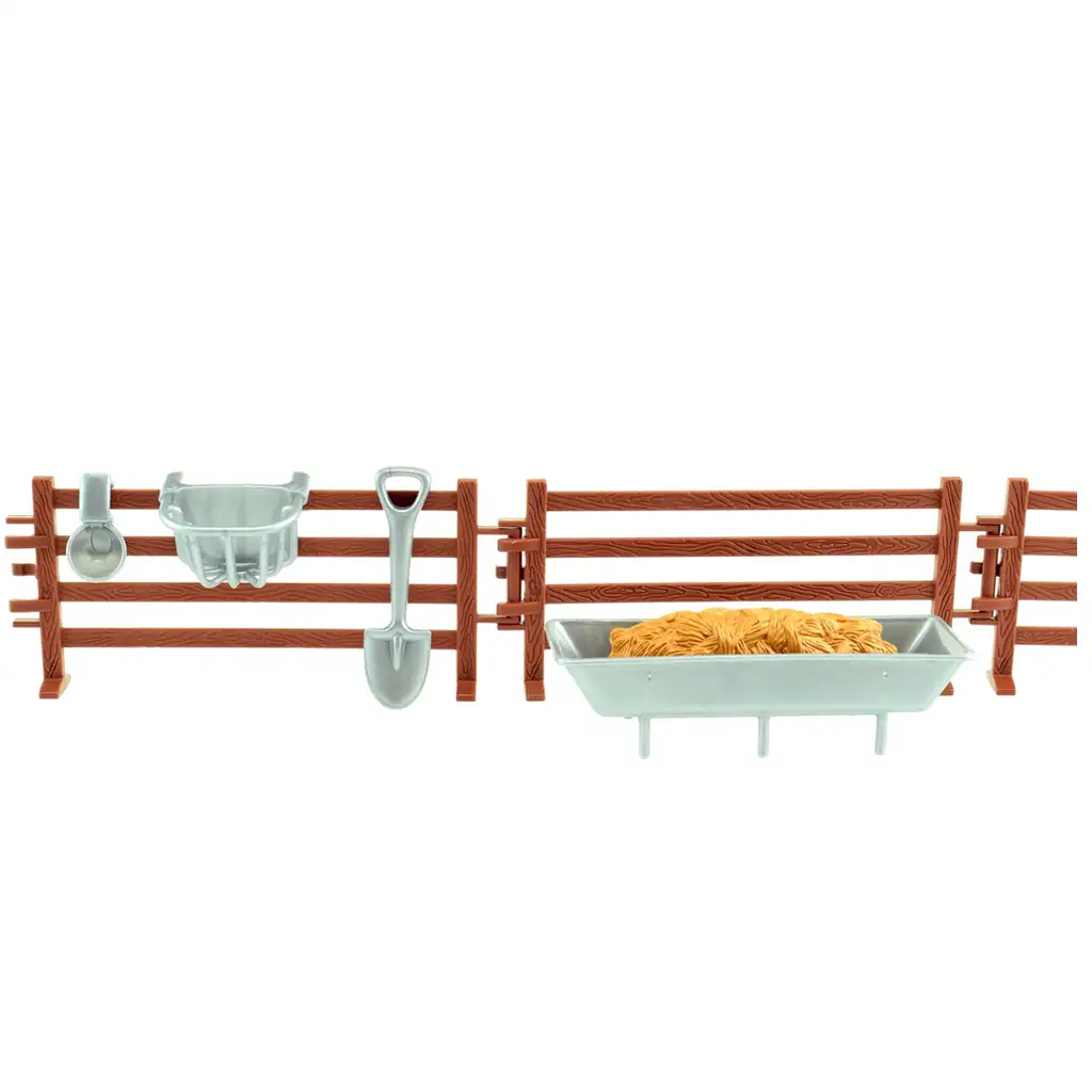 Koń i jeździec wykonani są z wysokiej jakości plastiku, z realistycznymi detalami, takimi jak uzda, popręg czy strój jeźdźca. Akcesoria – m.in. koryto, siano, łopata, wiadro i ogrodzenie zagrody – pozwalają dzieciom kompleksowo zatroszczyć się o ukochanego czworonoga. Zestaw rozwija zręczność, kreatywność i opiekuńcze nastawienie, a jednocześnie pozwala dzieciom zanurzyć się w świecie farmy.