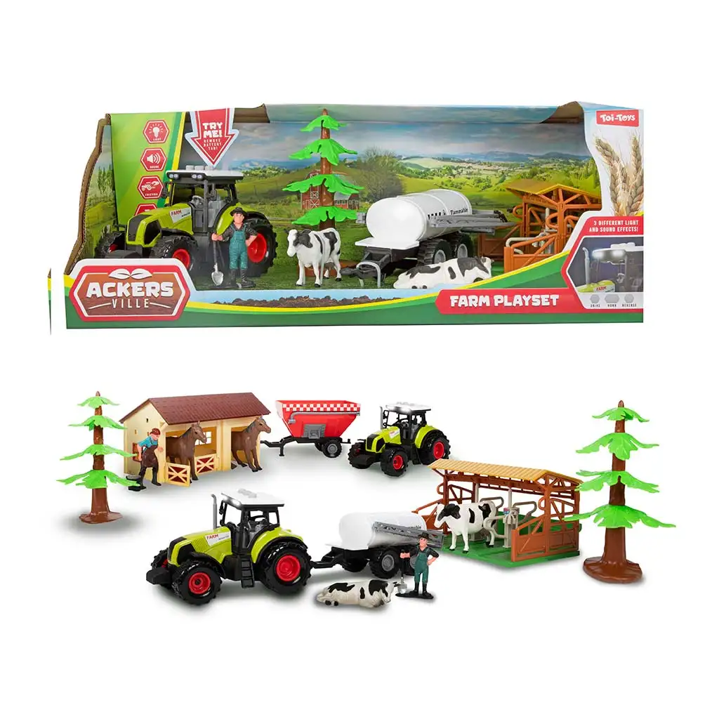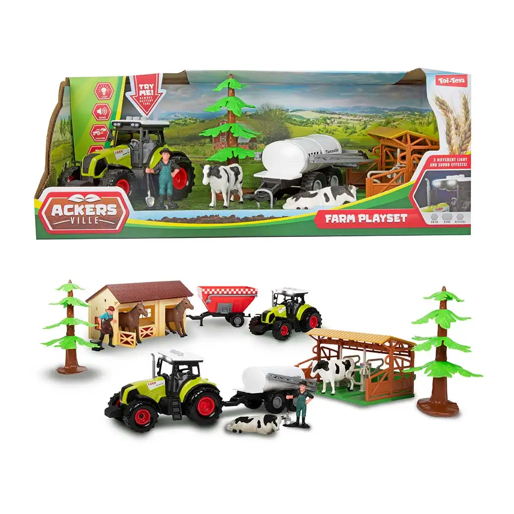 W zestawie znajduje się traktor z przyczepą, stajnia lub zagroda oraz różne figurki zwierząt i akcesoria gospodarskie. Dzieci mogą odtwarzać karmienie, opiekę nad zwierzętami, a nawet prace wokół farmy. Zabawa wspiera kreatywne myślenie i rozwój zabawy w rolę, jednocześnie pozwalając najmłodszym poznać świat rolnictwa.